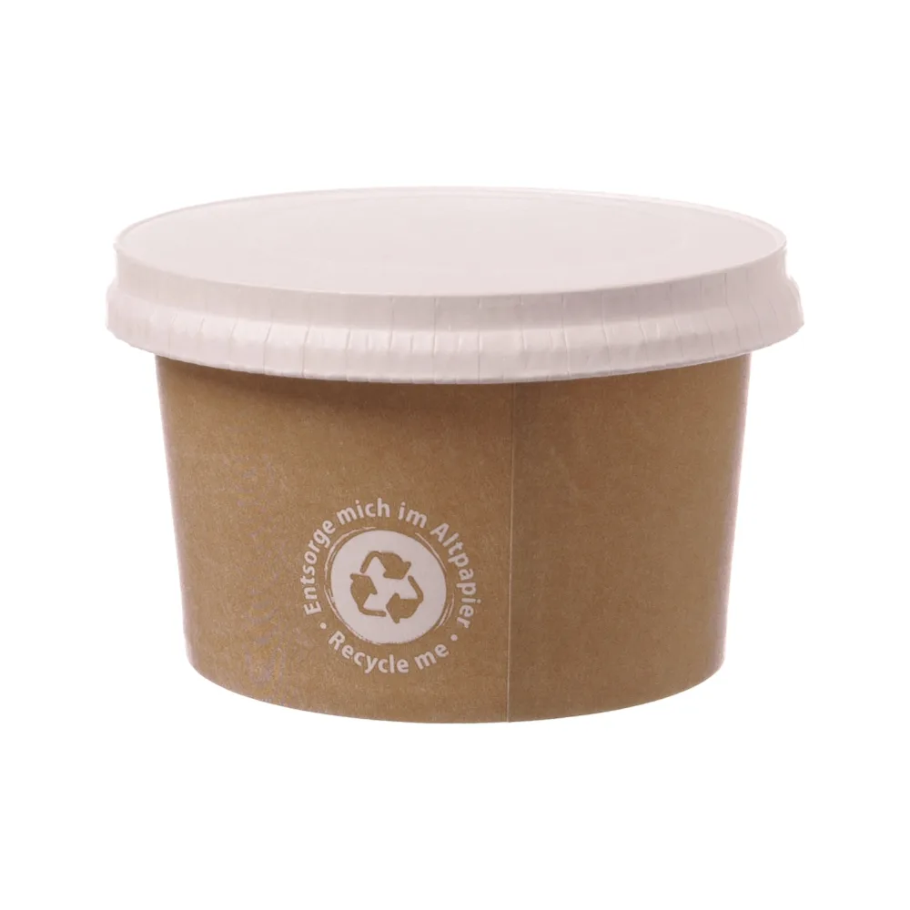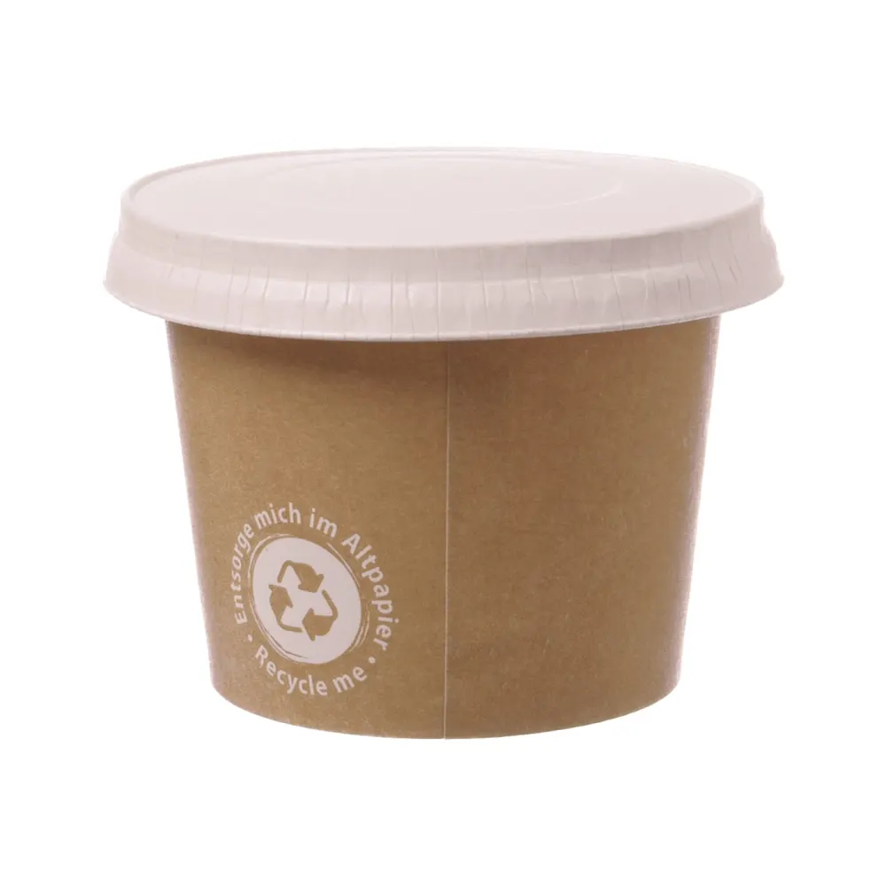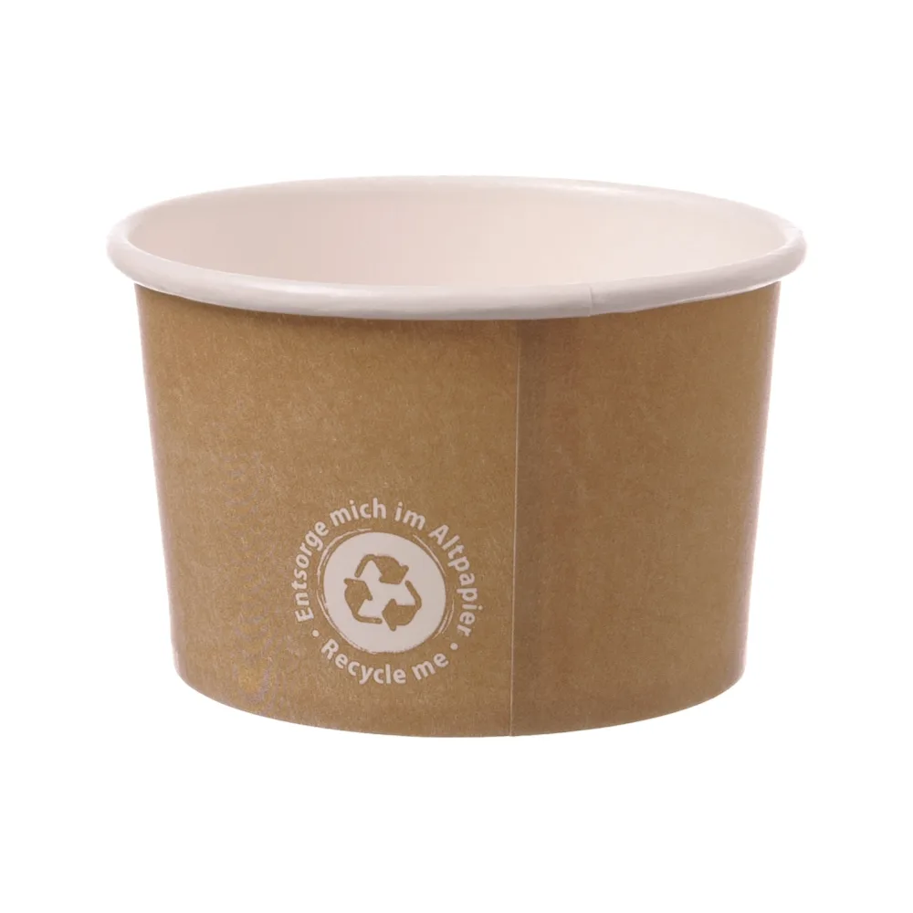 Die umweltfreundlichen Eisbecher „Recycle Me“ bestehen aus brauner, unbeschichteter Pappe und ermöglichen einen nachhaltigen Eisgenuss. Das dezente „RECYCLE ME“-Symbol zeigt klar: Diese Becher können nach Gebrauch problemlos über den Altpapierkreislauf recycelt werden.